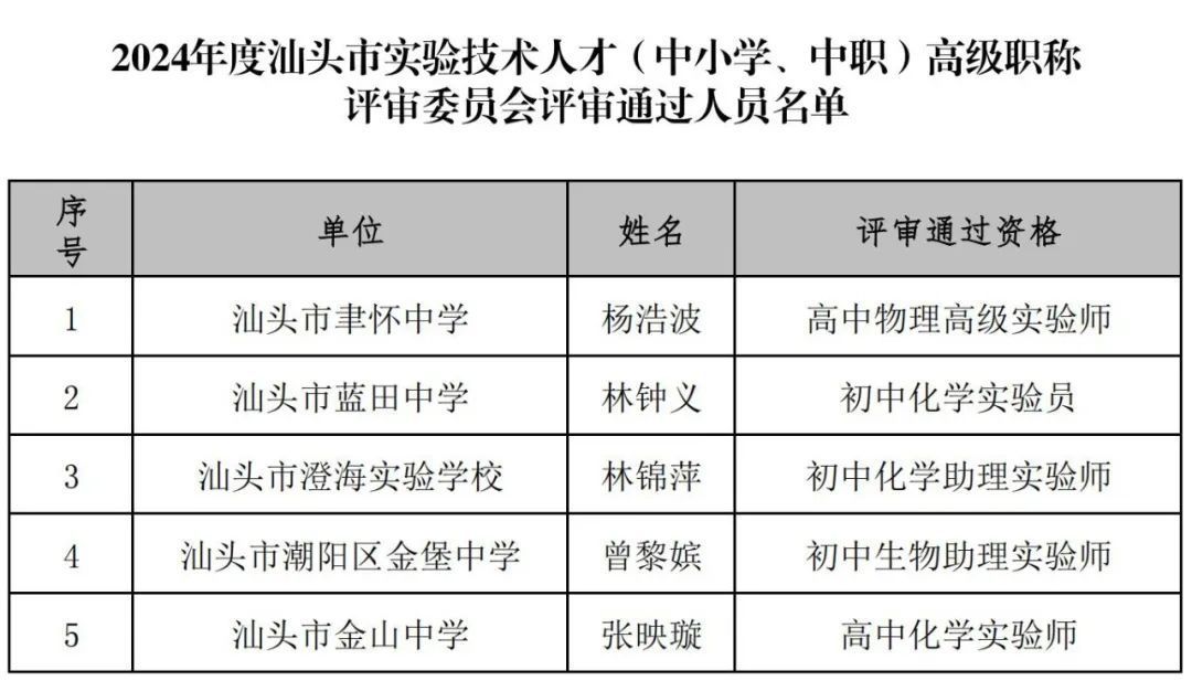 附:2024年度汕头市实验本领东谈主才(中小学、中职)高等职称评审委员会评审通过东谈主员名单