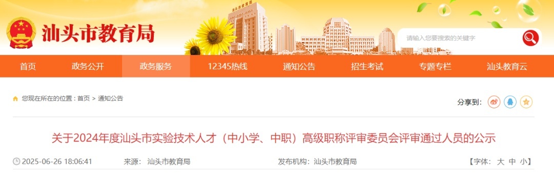字据《广东省职称评审处置服求践诺倡导及配套规则的见知》(粤东谈主社规﹝2020﹞33号)和《汕头市证据局对于作念好2024年度汕头市中小学和中职学校实验本领东谈主才职称评审使命的见知》(汕市教东谈主〔2024〕74号)等文献条目,现对汕头市实验本领东谈主才(中小学、中职)高等职称评审委员会评审通过的2024年度高、中、低级东谈主员(详见附件名单)进行公示。