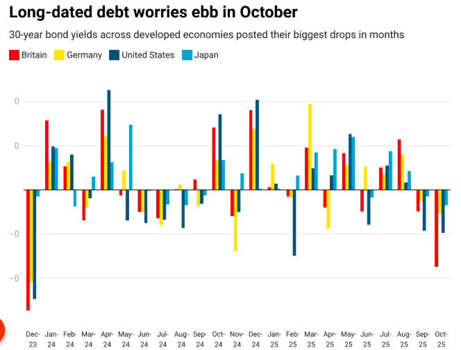 跟着对日本新首相高市早苗的财政担忧缓解,日本30年期国债收益率也有望创下自2024年8月以来最大月度跌幅。